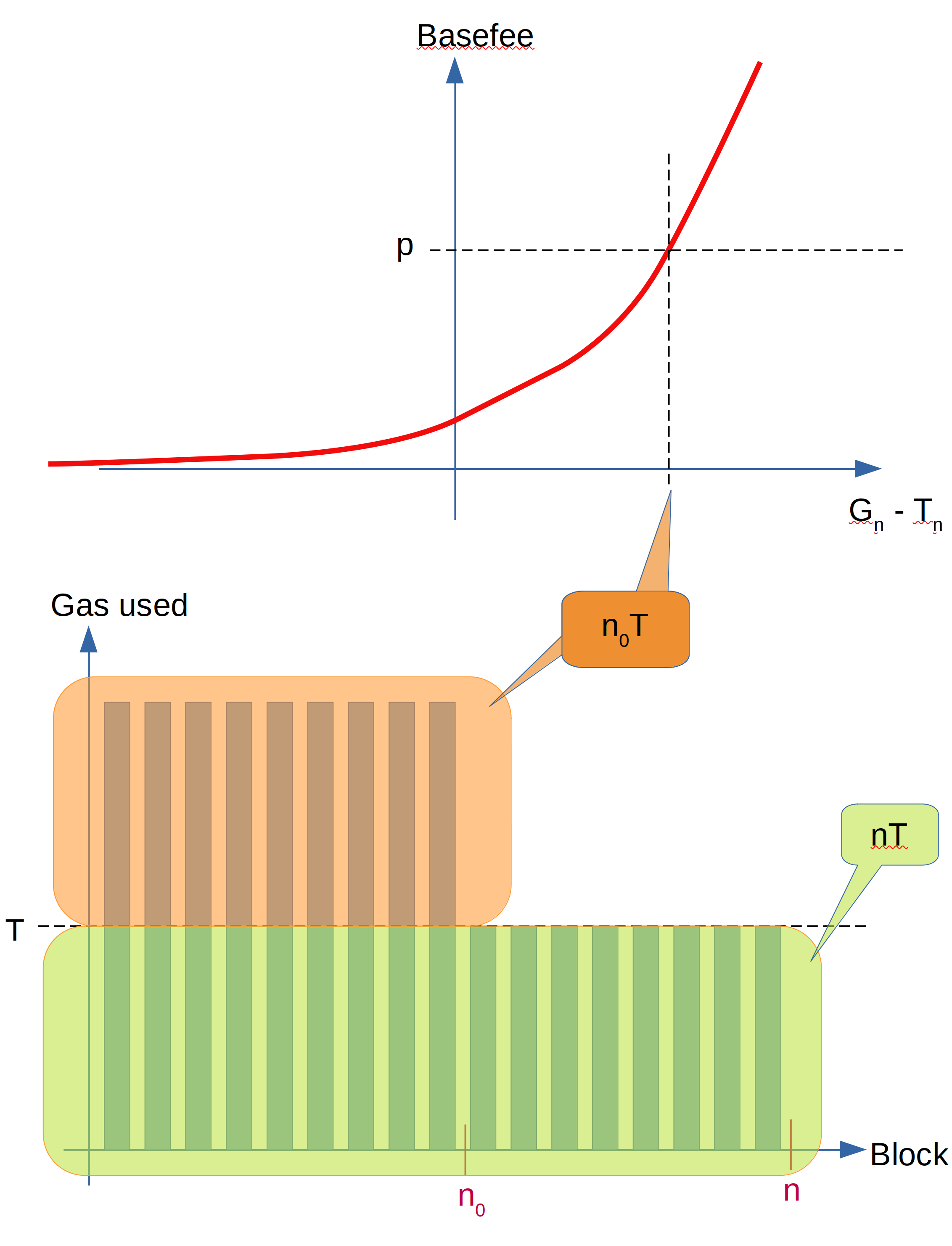 First let’s look at our simplified example. The following graph illustrates what is happening: Above you see the relation between total gas used and the basefee (an exponential function). Once in equilibrium, the basefee is at \(p\) which means that \(G_n-T_n = n_0 T\). Below we see how this adds up. The green shaded area of gas used is the blocks filled up to the target, and the orange area is the gas used above the target that sums up to \(n_0 T\).