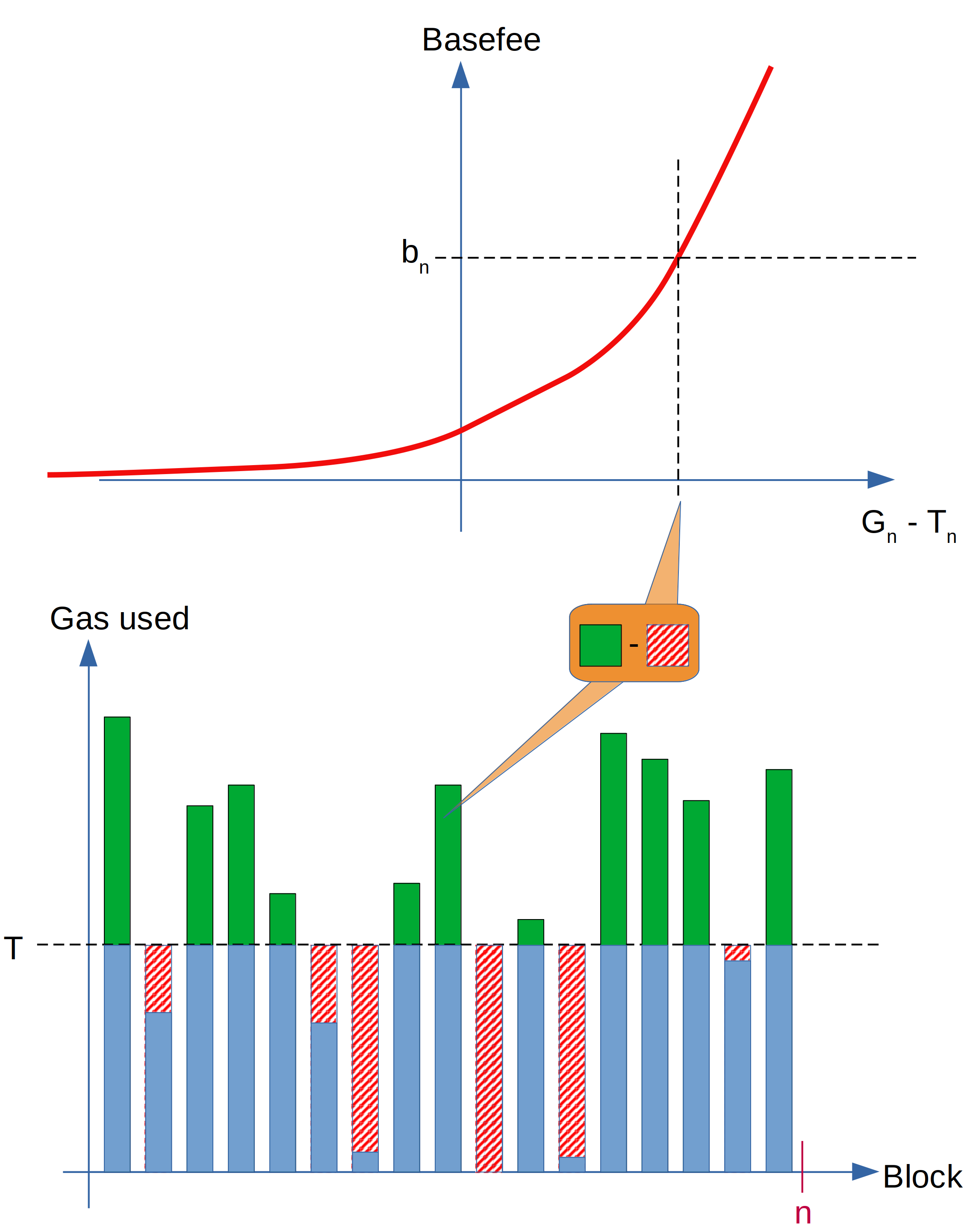 \[b_{n} = b_0 \exp\left(\frac{1}{TA}\left(\sum_{i=0}^{n-1}g_i - nT\right)\right)= b_0 \exp\left(\frac{1}{TA}\left(G_n - T_n\right)\right)\]where we used \(G_n = \sum_{i=0}^{n-1}g_i\) for the total gas used since block 0 and \(T_n = nT\) the cumulative gas target.