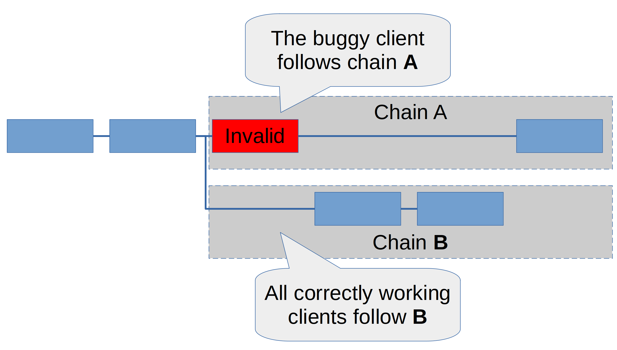 The buggy client has more than 1/2 and less than 2/3 of the stake. In this case, we will see two chains being built – A by the buggy client, and B by all other clients. Neither chain has a 2/3-majority and therefore they cannot finalize. As this happens, developers will scramble to understand why there are two chains. As they figure out that there is an invalid block in chain A, they can proceed to fix the buggy client. Once it is fixed, it will recognize chain A as invalid. It will thus start building on chain B, which will allow it to finalize. This is very disruptive for users. While hopefully the confusion between which chain is valid will be short and less than an hour, the chain probably won’t finalize for many hours, potentially even a day. But for stakers, even the ones running the buggy client, the penalties would still be relatively light. They will receive the “inactivity leak” penalty for not participating in chain B while they were building the invalid chain A. However, since this is likely less than a day, we are talking of a penalty that’s less than 1% of the stake.