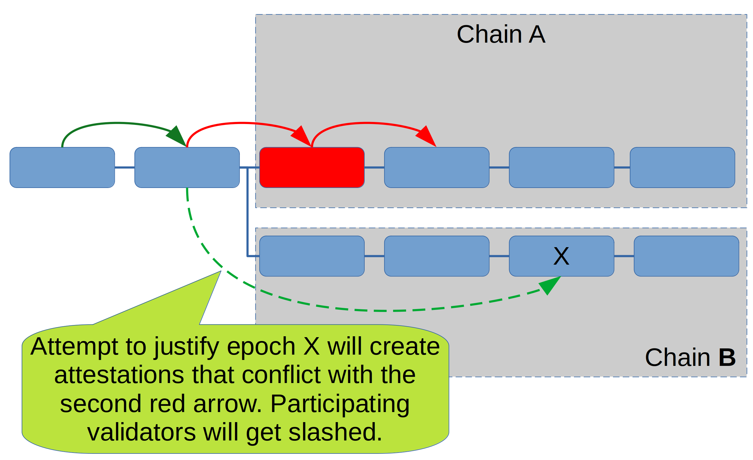 However, in order to participate in the justification of epoch X (which needs a supermajority link as indicated by the dashed green arrow), they would have to “jump over” the second red arrow – the one that finalized the invalid epoch. Voting for both of these links is a slashable offense.