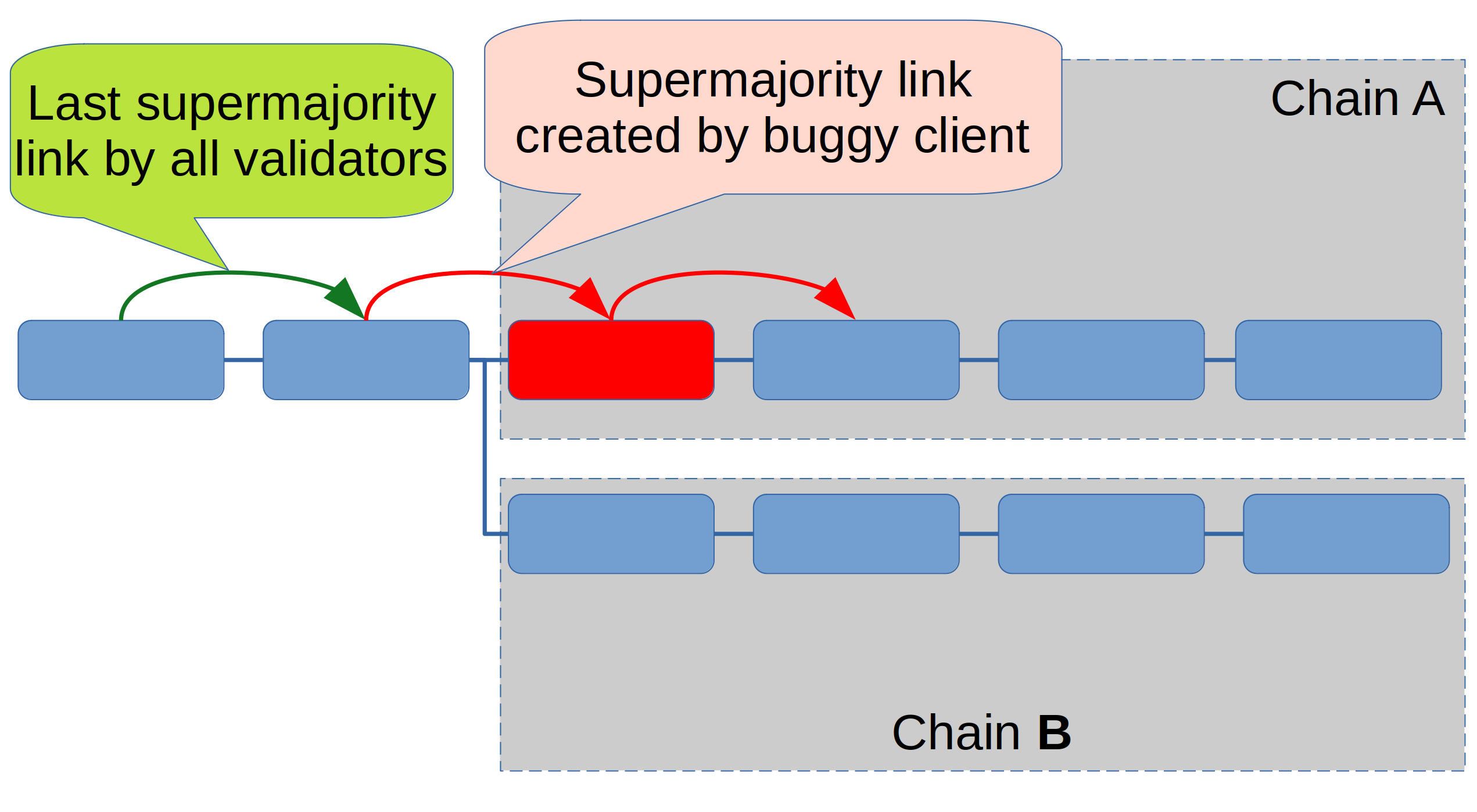 The rounded boxes in this picture represent epochs, not blocks. The green arrow is the last supermajority link created by all validators. The red arrows are supermajority links that were only supported by the buggy client. Correctly working clients ignore the epoch with the invalid block (red). The first red arrow will justify the invalid epoch, and the second one finalizes it.