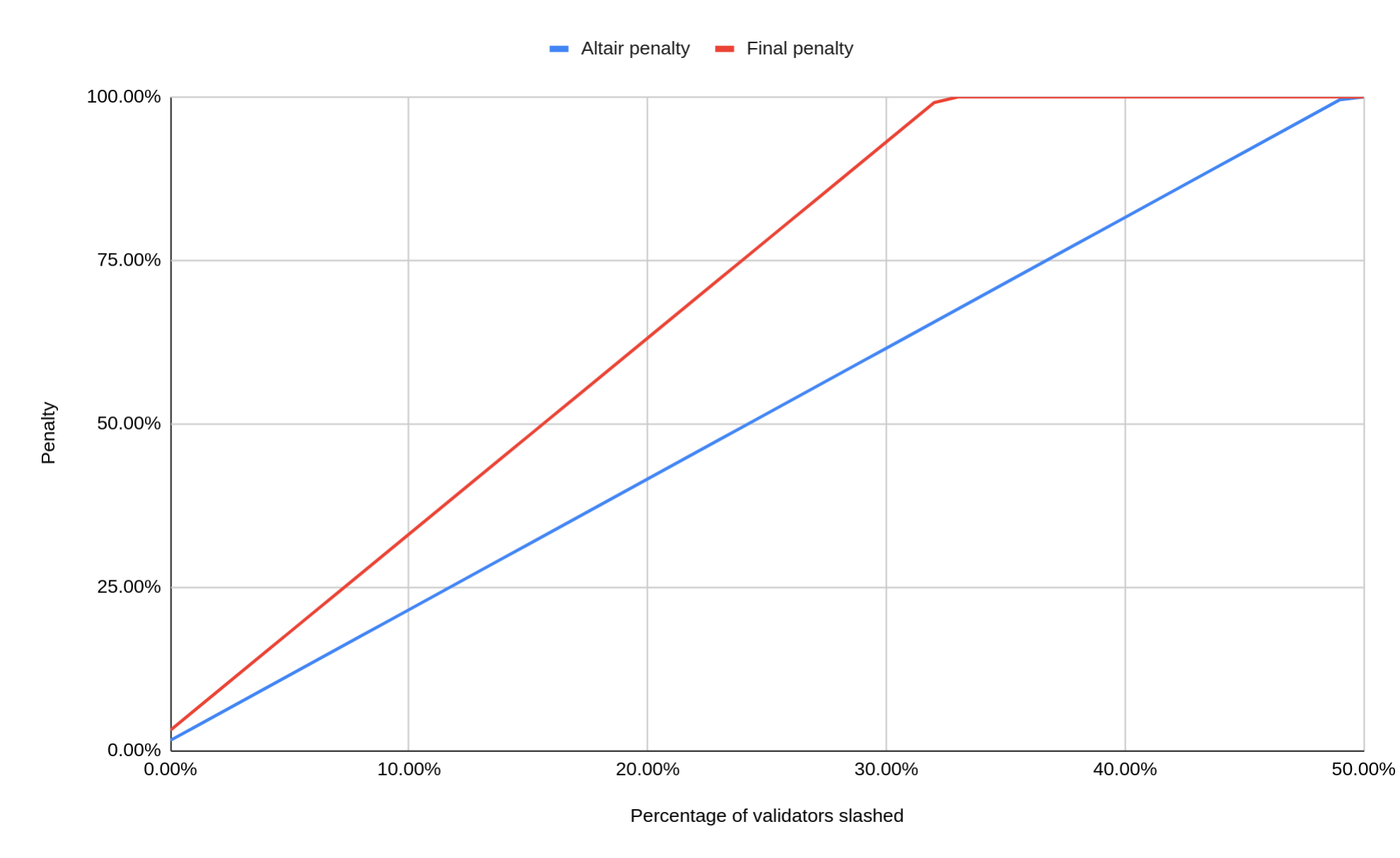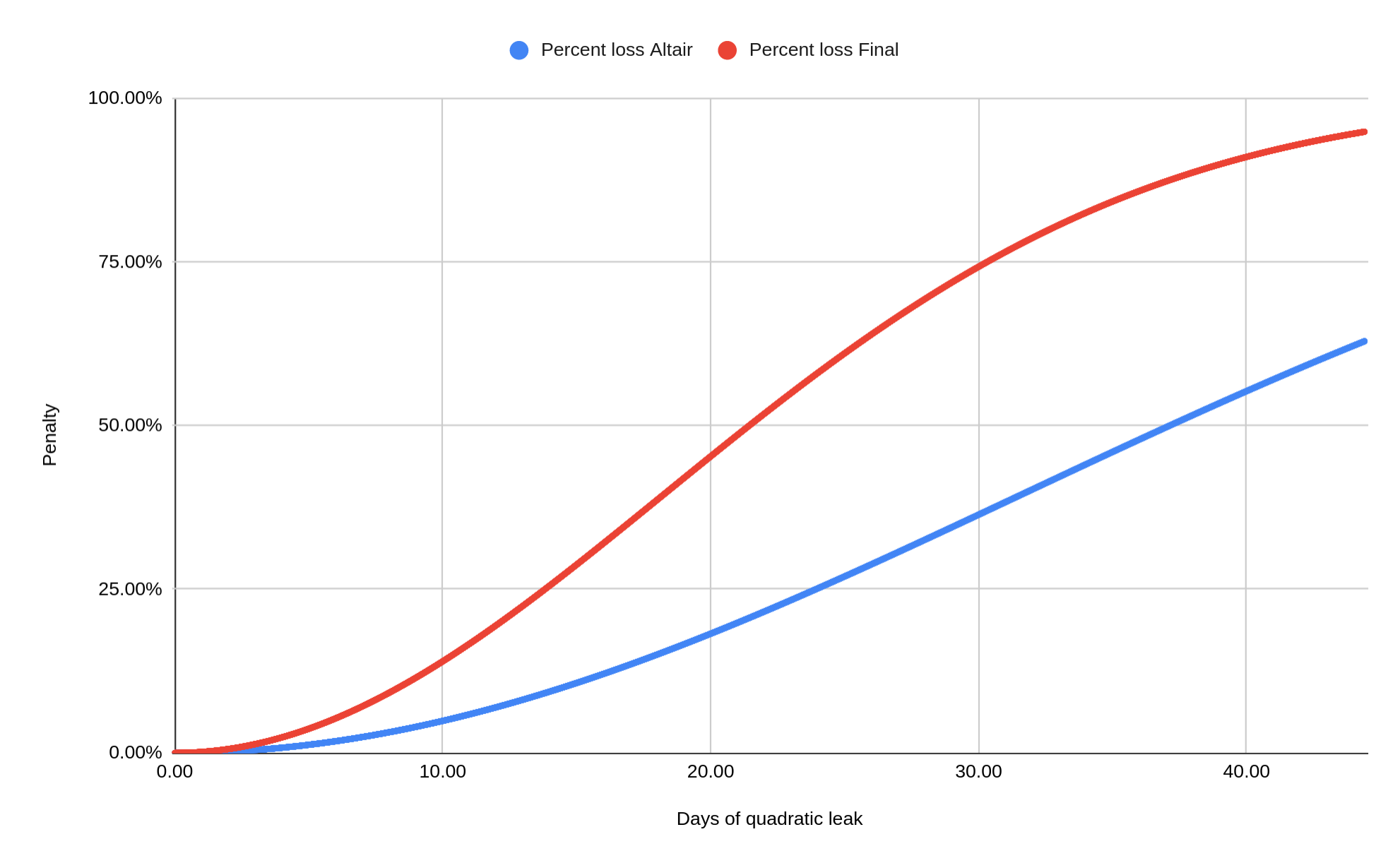 To restore liveness in a scenario like this the so-called “quadratic inactivity leak” kicks in. The total penalty amount raises quadratically with time if a validator continues being offline while the chain is not finalizing. Initially it is very low; after ~4.5 days, the offline validators will lose 1% of their stake. However, it increases to 5% after ~10 days and to 20% after ~21 days (these are Altair values, they will be doubled in the future).